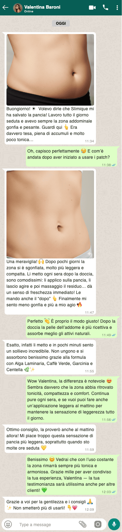 Già dal primo utilizzo molti utenti riferiscono una sensazione di pancia più sgonfia, pelle più compatta e un comfort immediato grazie al patch che crea un vero e proprio effetto “fascia attiva” professionale, favorendo un assorbimento profondo e mirato degli attivi.