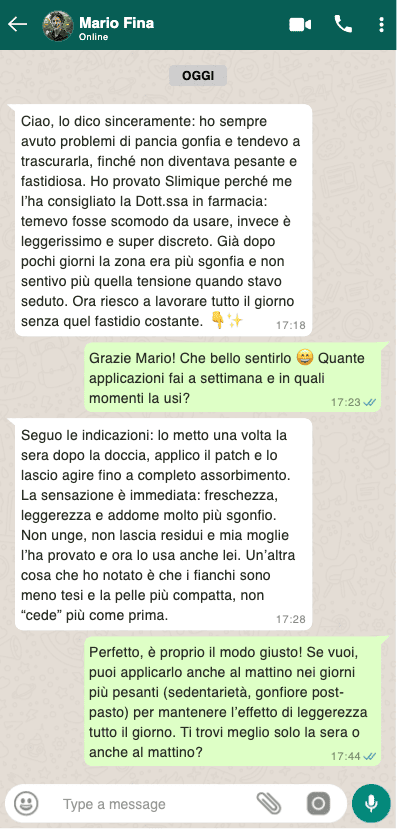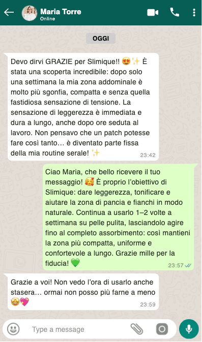 Slimique è un trattamento cosmetico non invasivo, rapido e delicato, adatto a tutti i tipi di pelle. Non promette miracoli, ma aiuta concretamente a ritrovare una sensazione di pancia più piatta, una migliore tonicità cutanea e un progressivo effetto rimodellante se utilizzato con costanza. Come per ogni prodotto naturale, i risultati possono variare da persona a persona: consiglio di applicare il patch sulla pelle pulita e lasciarlo agire per il tempo indicato per favorire un assorbimento completo dei principi attivi.